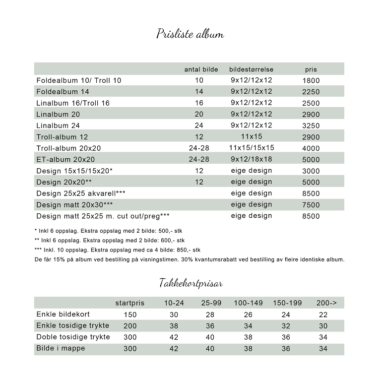 De betalar for fotograferinga og kjøper bildeprodukta de ønskjer av oss kvar for seg. Inkluderer planleggingstime, nettvisning og bestillingstime på inntil 2 timar. På bestillingstimen får de 15% rabatt på bildeprodukt og rammer.